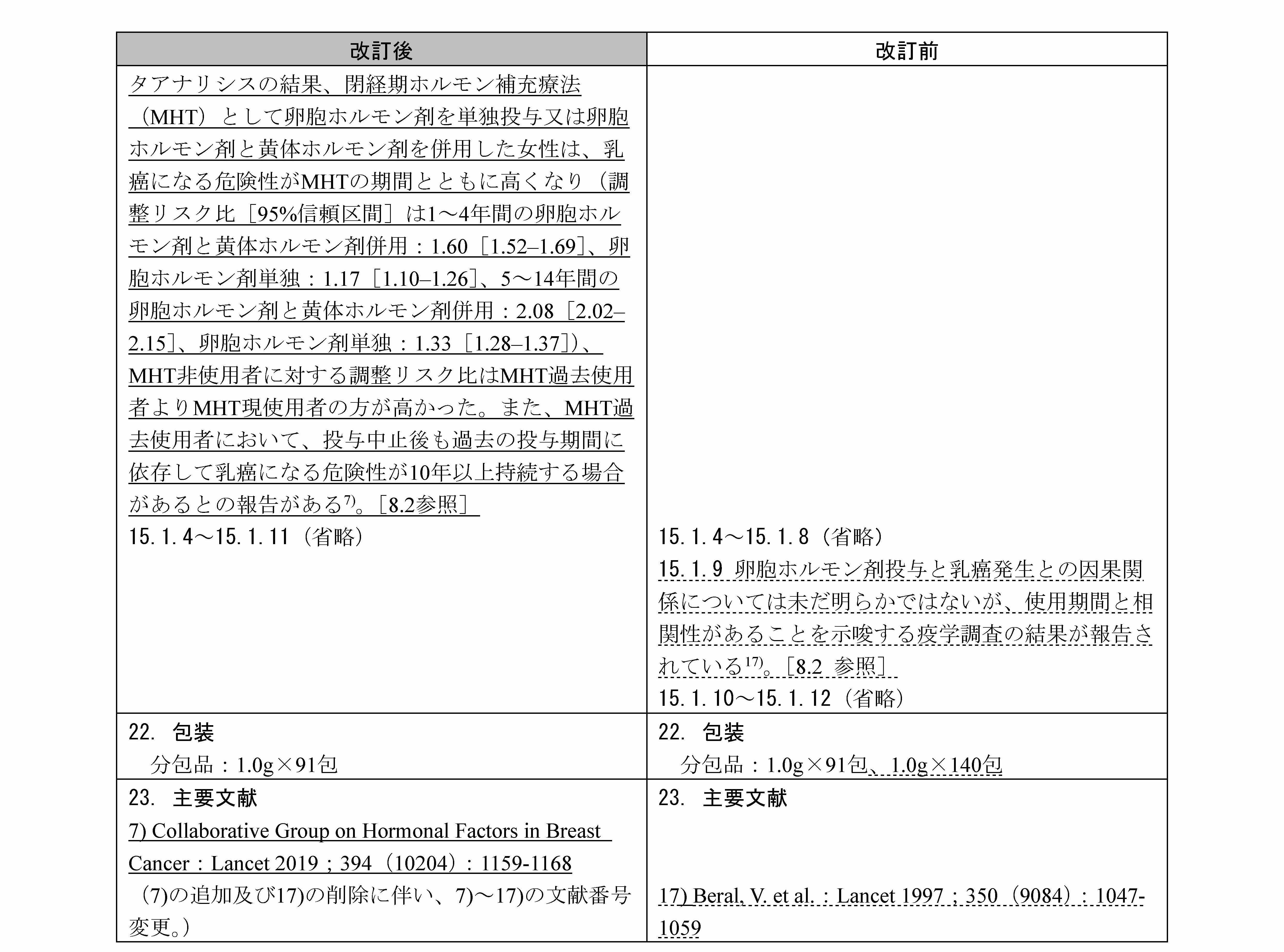 - 腟剤を除く全ての閉経期ホルモン補充療法は乳癌リスク増加と関連し、使用期間が長いほどリスクが増加し、過去使用者において投与中止後も過去の投与期間に依存して乳癌になる危険性が持続したとの報告。