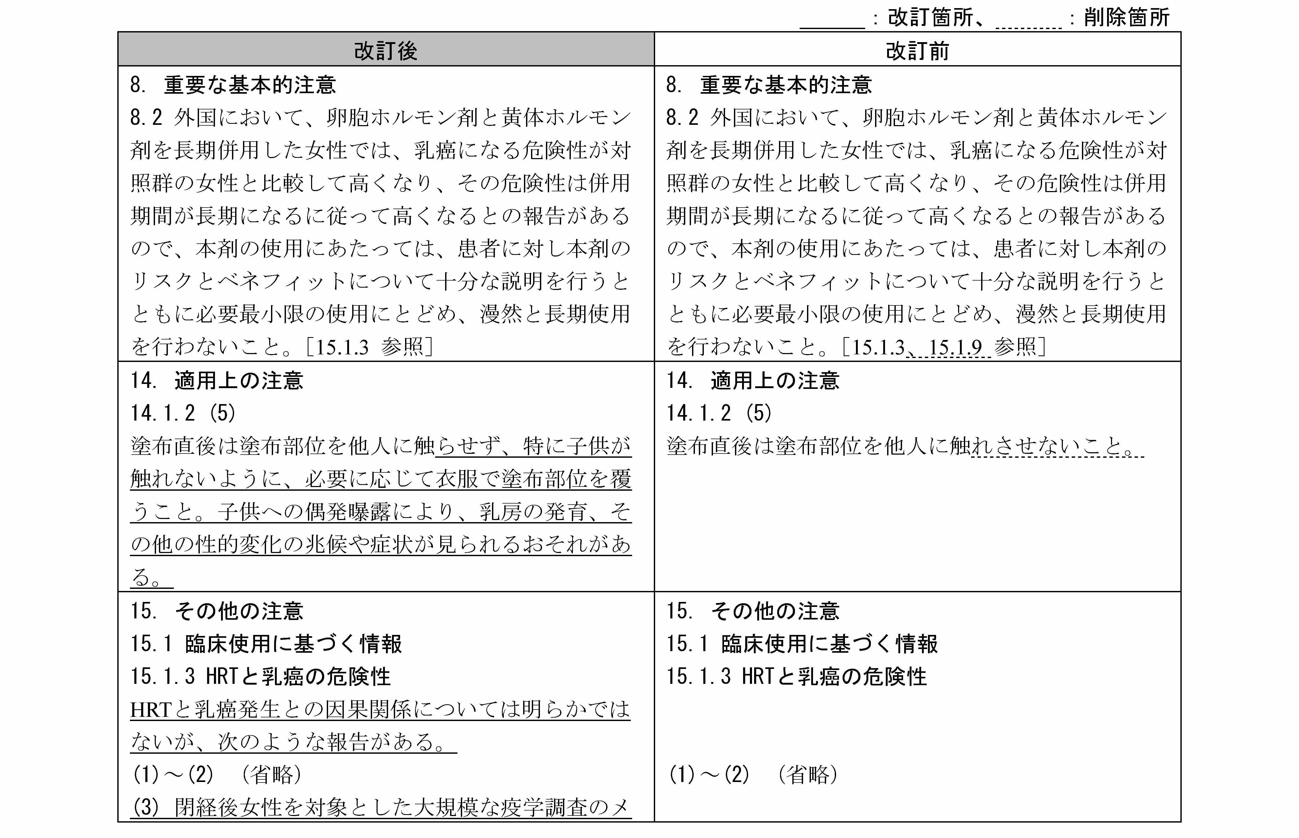 閉経期女性のホルモン補充療法と乳癌との因果関係は明らかではないものの、海外における大規模疫学調査の以下結果が専門委員で協議され、当該項目の改訂が適切と判断されました。